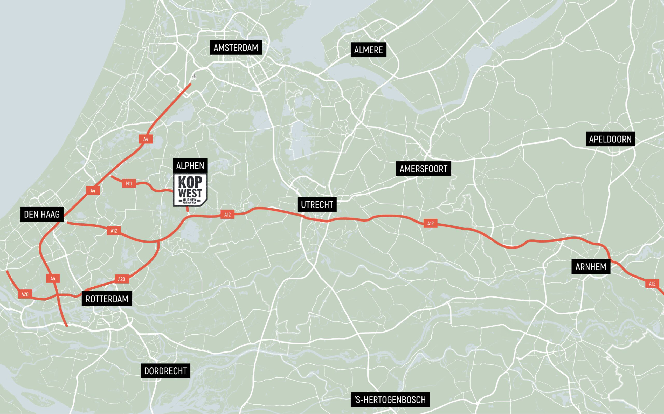 Kop West ligt op een strategische plek in het Groene Hart. Direct aan de Rijnhaven, tegen het centrum van Alphen aan den Rijn. Dankzij de nabijheid van de N11, A4 en A12 is je bedrijf goed bereikbaar vanuit steden als Den Haag, Rotterdam, Utrecht en Amsterdam.
